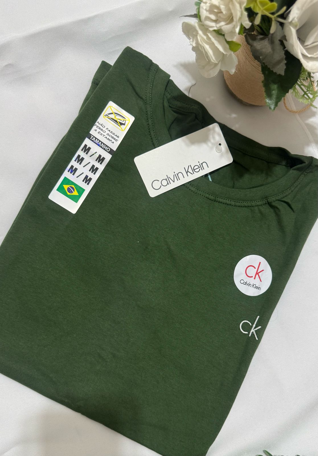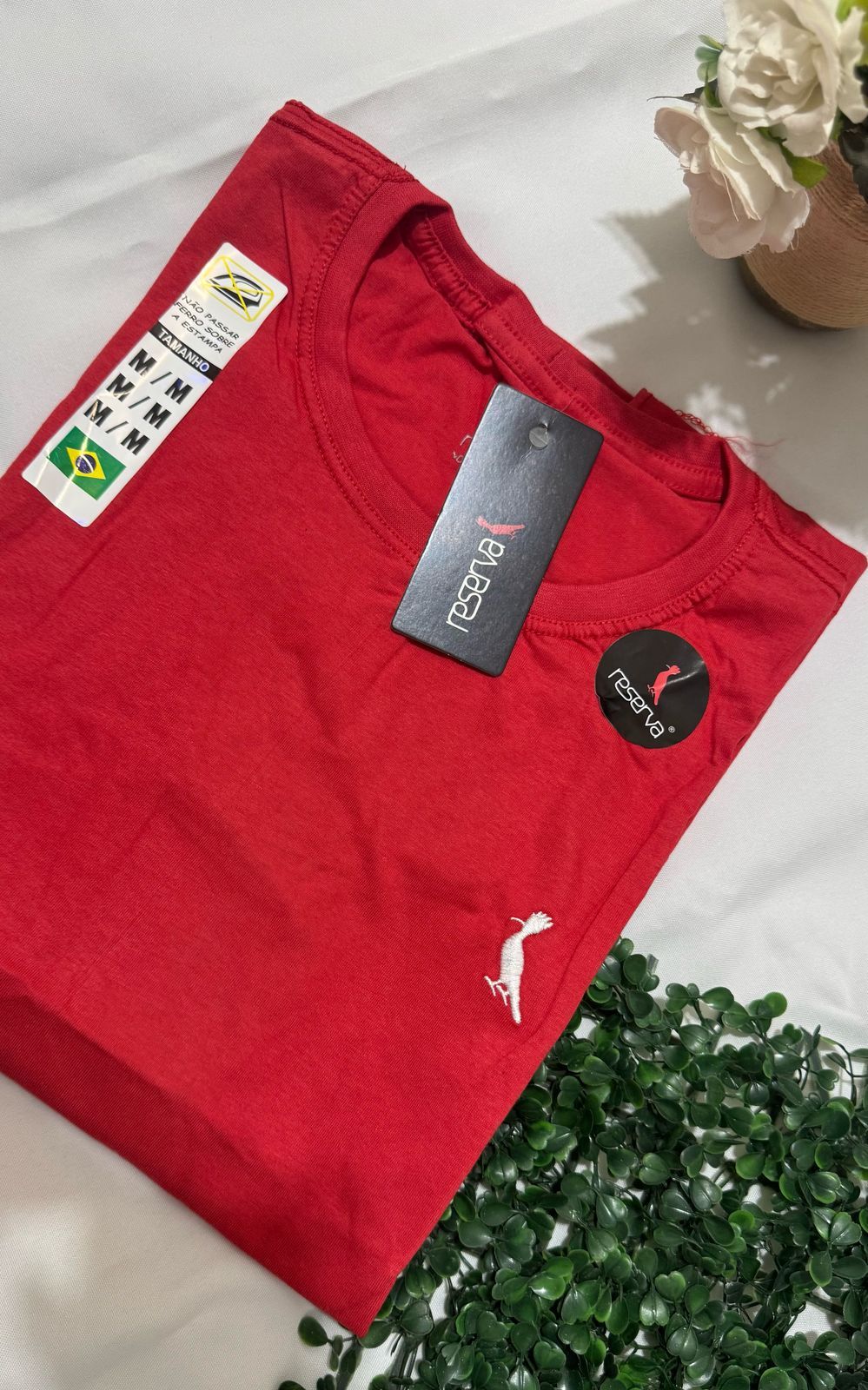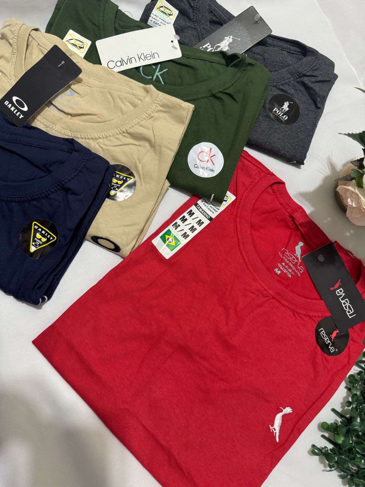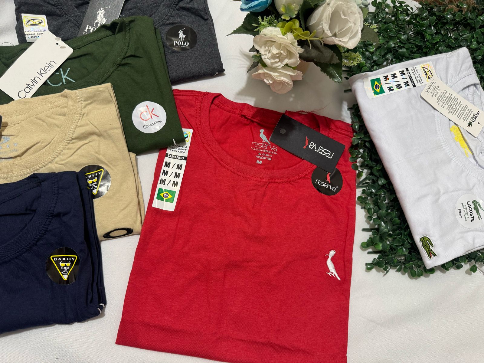 Na imagem, as camisetas aparecem dobradas e organizadas, evidenciando a variedade de cores sólidas como vermelho, verde, bege, azul-marinho e cinza. O modelo apresenta gola careca (redonda) com acabamento reforçado, costuras bem definidas e caimento tradicional, garantindo conforto e visual moderno. Algumas peças contam com detalhes bordados discretos no peito, agregando sofisticação ao design.
